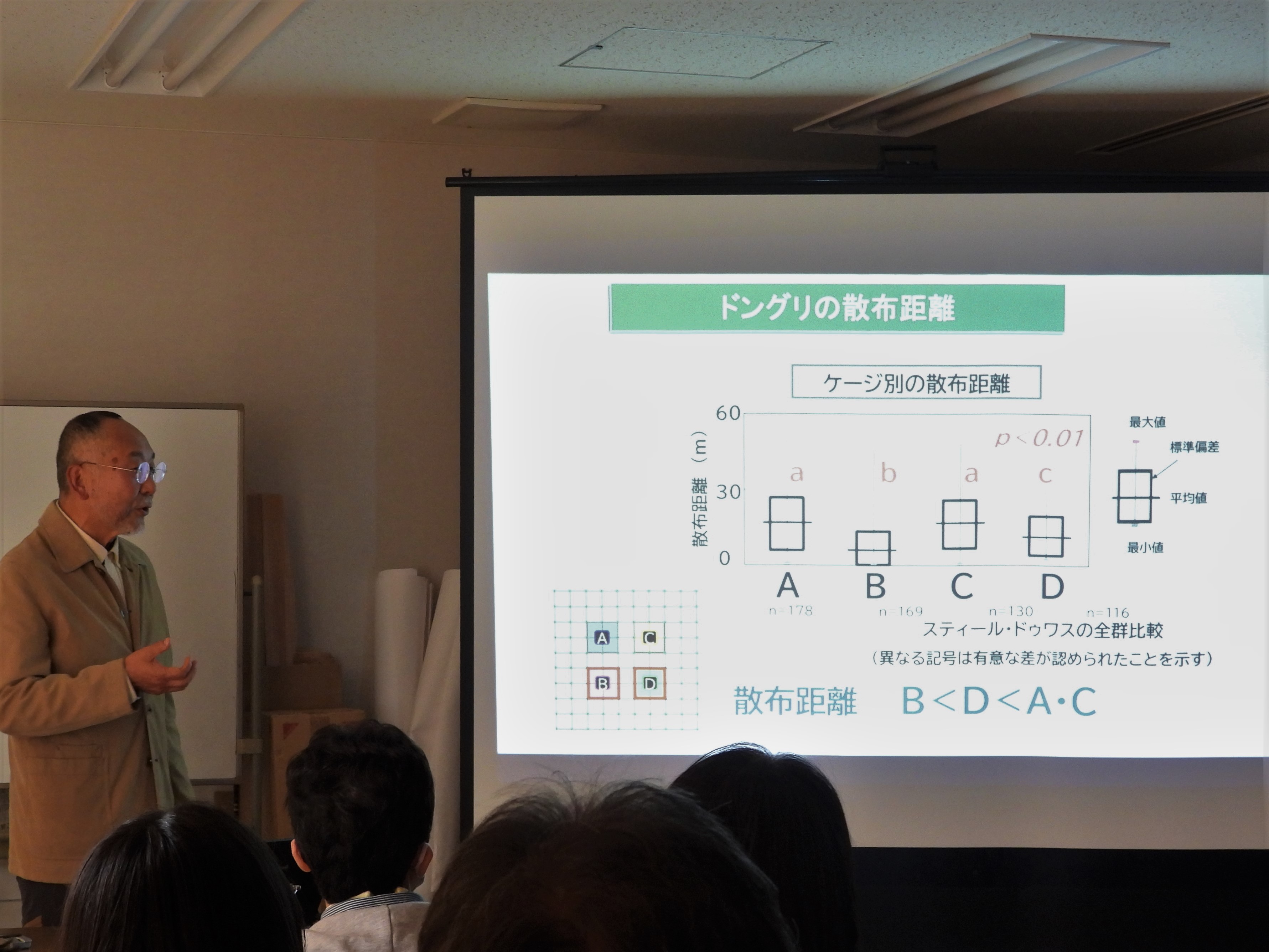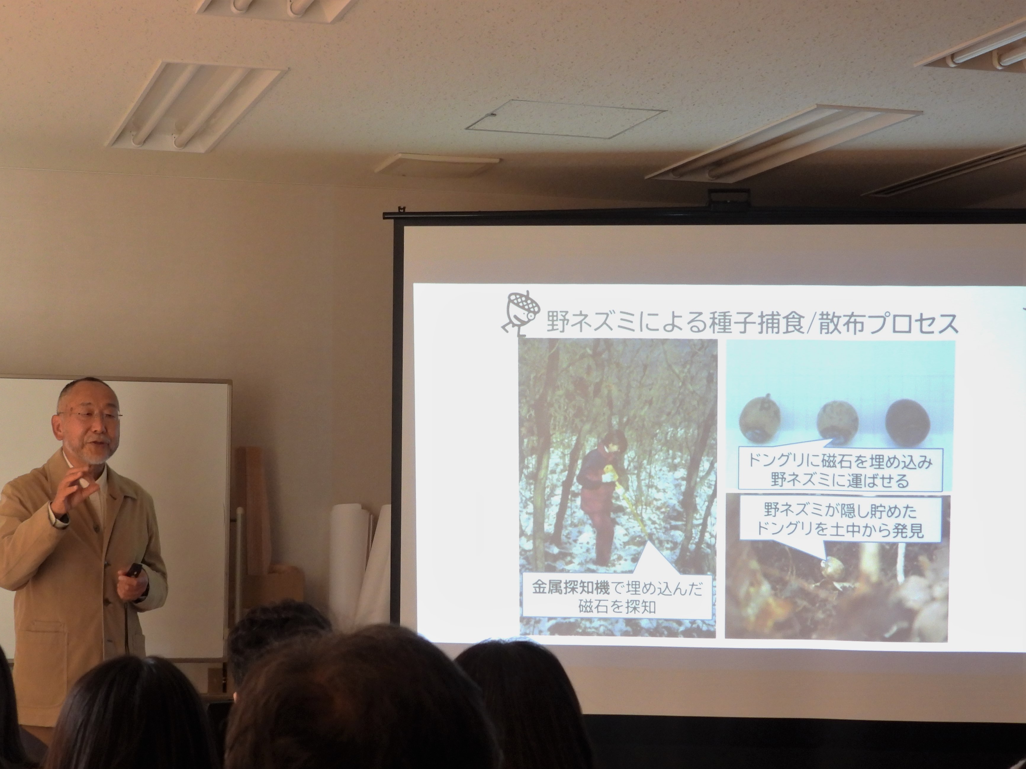 次に、ドングリの種子散布におけるネズミの役割について、箕口博士の過去に行った研究などをもとに解説をしていただきました。