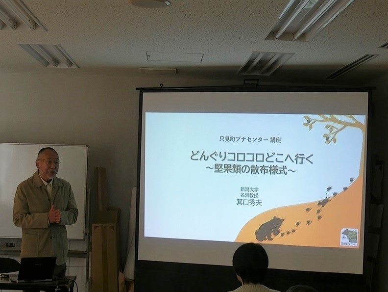 2025年10月25日(土)、新潟大学名誉教授の箕口秀夫博士を迎え、只見町ブナセンター講座を開催しました。参加者は18人でした。講座の内容は森林と動物の相互関係、特にドングリとネズミの関係を例に動物が森林に与える影響についての話を中心に進みました。