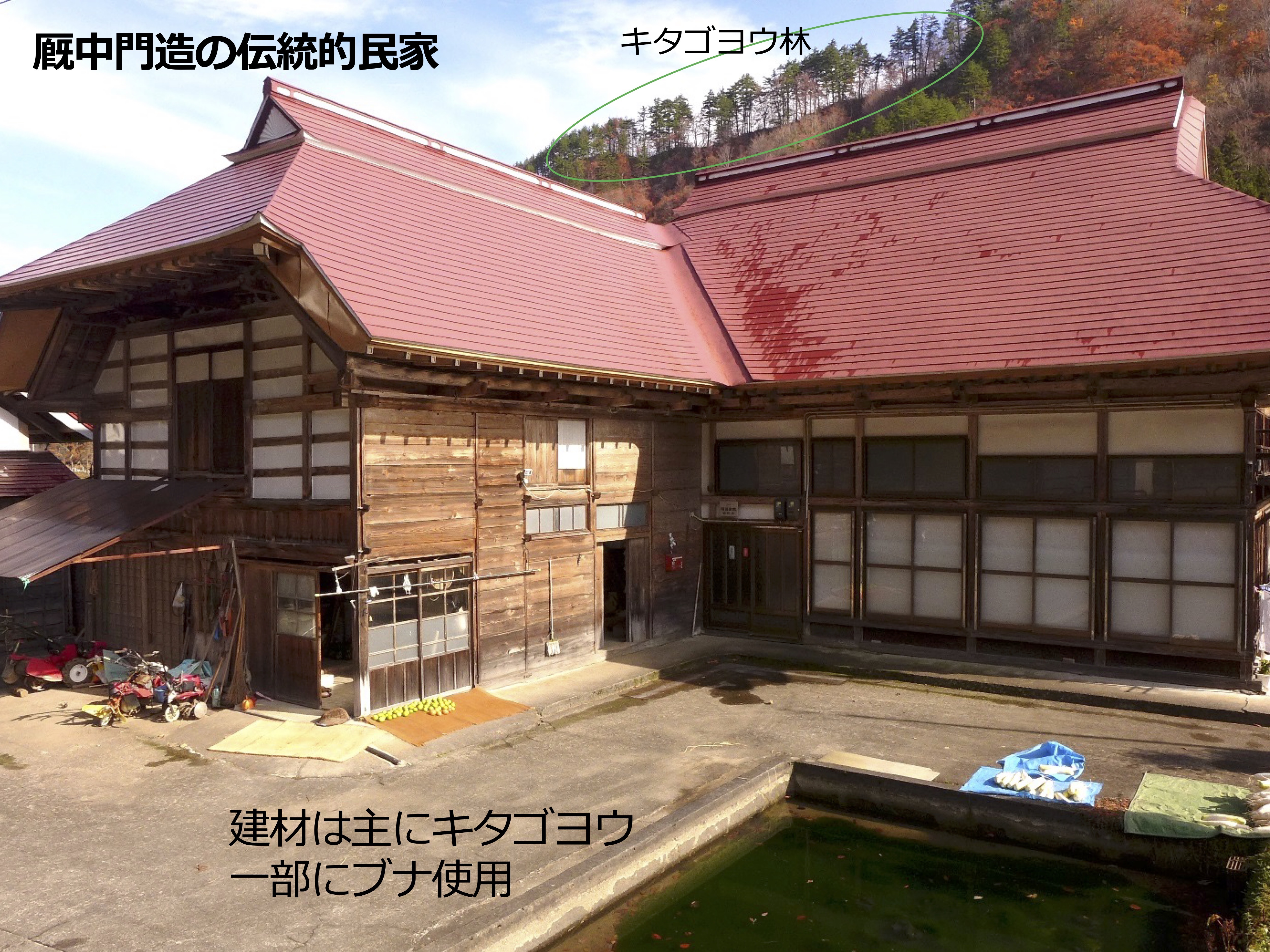 この伝統的民家ですが、多くは新潟から来た大工さんにより作られたようです。構造材はもちろん木材です。この木材に注目して、どのような樹木の木材で作られ、それら樹木は只見の植生とどの様な関係にあったのかを、信州大学教育学部の井田秀行教授らが調べてくれています。その結果、伝統的民家の構造材にはキタゴヨウなど只見地域の山林に自生する樹木が使われ、柱や梁などの部位別に樹木の木材としての特性を踏まえた上で適材適所で使われていることが明らかになっています(Ida et al. 2023)。