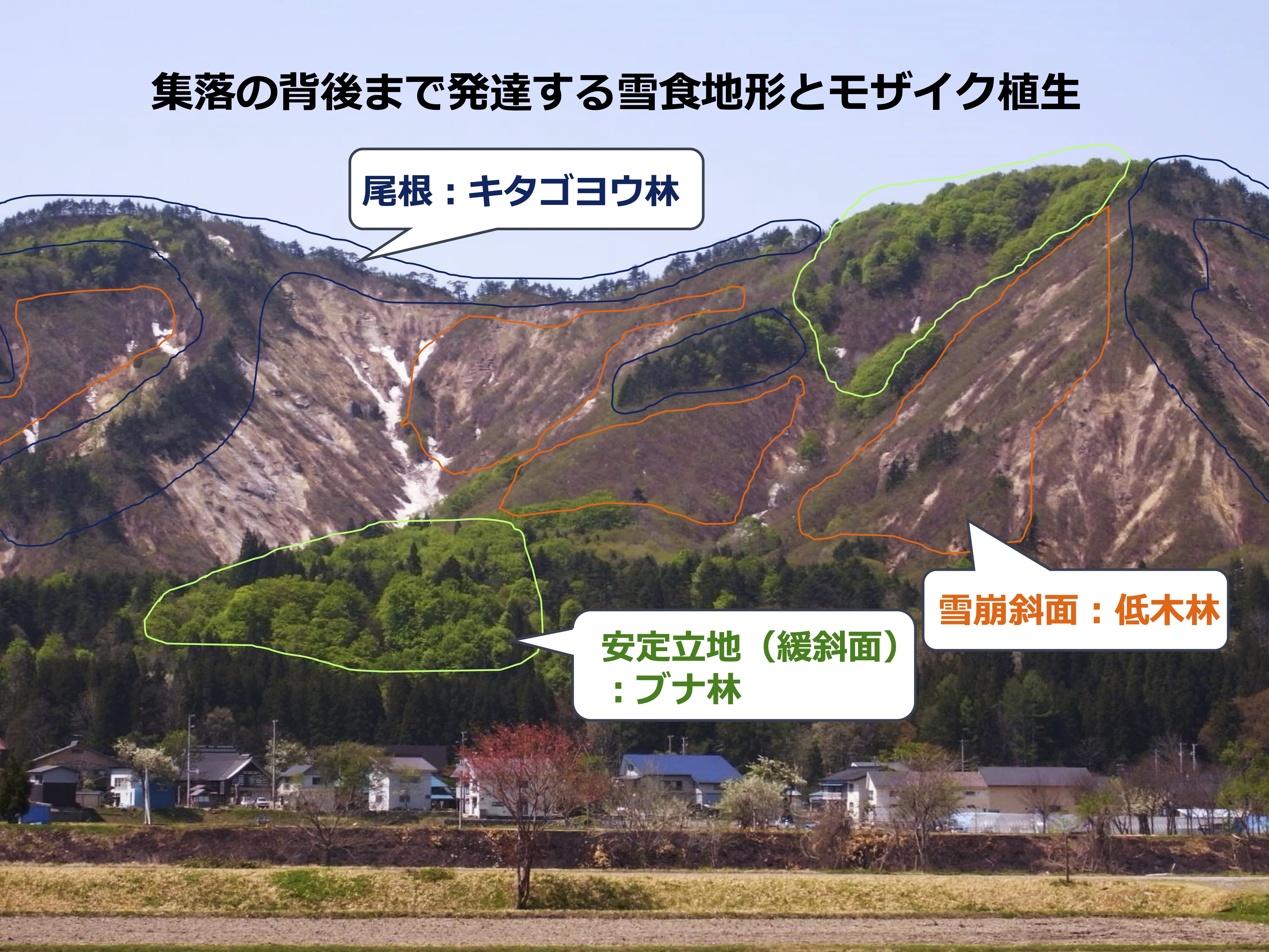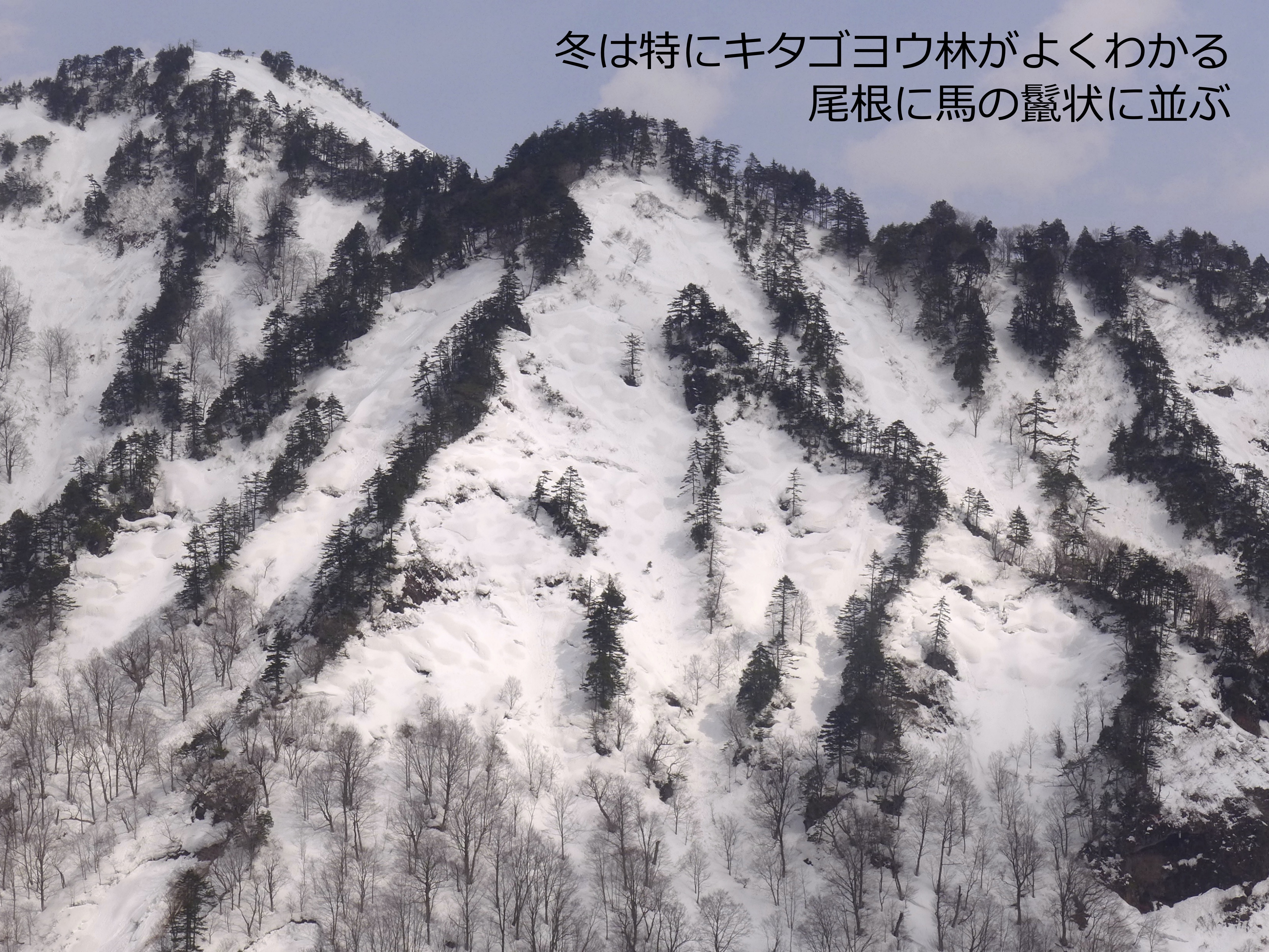 構造材に多く使われていたキタゴヨウは、マツ科マツ属の常緑高木で、只見地域では雪食地形の最上部の痩せ尾根に生育しています。このキタゴヨウの林は痩せ尾根に列状に並んで成立しており、その姿はまるで馬の鬣(たてがみ)のようで、只見地域の景観の大きな特徴ともなっています。一般に針葉樹は、多雪地帯では生育が制限され、発達した森林を作ることが困難とされています。キタゴヨウについても、その生育地は痩せ尾根の岩石部に限られていますが、こうした場所は、風により雪が飛ばされ積雪が少ないため、キタゴヨウにとって好適な立地環境であると考えられています。